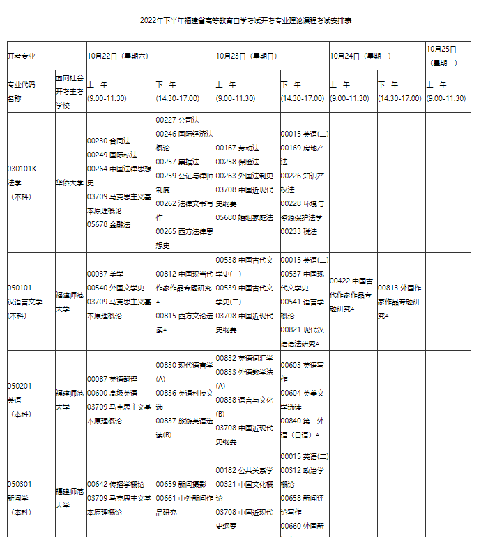 根据《教育部教育考试院关于2022年上半年高等教育自学考试延期考试全国统考课程考试安排有关事项的通知》(教考院函〔2022〕44号)精神,按照“确保所有专业理论课程年度考试科目全覆盖”的原则,我省在原10月22日、23日的理论课程考试安排不变的基础上,增加了10月24日、25日上午一天半考试时间,用于安排10月考试计划中没有的4月份考试科目。